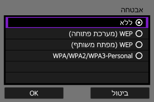 - יש להגדיר אותו סוג של אבטחה גם במכשיר השני וגם במצלמה. ראה שיטות אימות והצפנת נתונים לפרטים על סוגי אימות והצפנה.