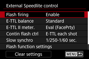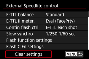 - בחרו ב-[Clear flash settings/נקה הגדרות מבזק] או [Clear all Speedlite C.Fn's/נקה את כל Speedlite C.Fn].