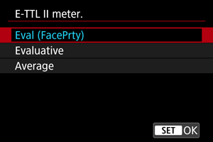 - הגדירו את [E-TTL each shot/E-TTL כל צילום] כדי לבצע מדידת מבזק בכל צילום.