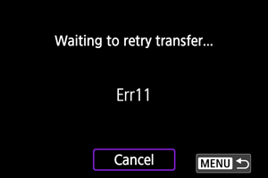 לאחר שתפתור את הבעיה, התמונות שלא ניתן היה להעביר בתחילה יועברו אוטומטית. כאשר אפשרות זו מופעלת, העברה שנכשלה מתבצעת שוב באופן אוטומטי בין אם נעשה שימוש בהעברה אוטומטית ובין אם התמונות שצולמו מועברות דרך FTP. שים לב שאם תבטל העברה או תכבה את המצלמה, לא ייעשה ניסיון חוזר אוטומטי.