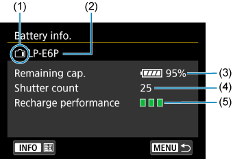 - תצוגת הקיבולת הנותרת במרווחים של 1% אינה מוצגת עם מארז הסוללה LP-E6NH/LP-E6N או ידית סוללות BG-R10 מחובר. יתר על כן, לא ניתן לרשום סוללות אלו.