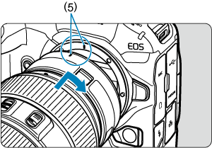 - Poravnajte crvene oznake za montažu (5) na adapteru i fotoaparatu te okrenite objektiv u smjeru strelice prikazane na slici dok ne klikne.