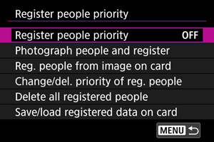 Na fotoaparatu možete registrirati osobe kako bi fotoaparat pokušao otkriti njihova lica i dati im prednost pri izoštravanju te prilagodbi svjetline i tona boje prilikom snimanja. Za registriranje lica možete nekoga fotografirati ili upotrijebiti njegovu fotografiju s memorijske kartice.