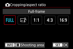 Kad koristite RF ili EF objektiv, možete promijeniti format slike prije snimanja. Možete koristiti [1.6x (crop) / 1,6x (izrez)] za snimanje kao da koristite telefoto objektiv jer ova opcija povećava središte slike (područje ekvivalentno veličini APS-C).