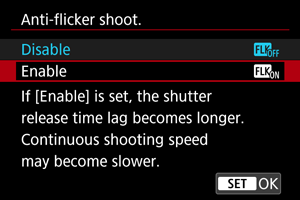 , odabrati [Anti-flicker shoot. / Snimanje pod treperavim svjetlom] i zatim pritisnuti tipku