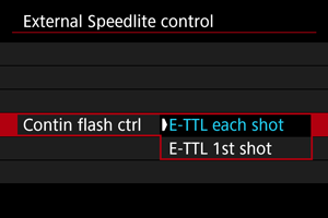 - Podesite na [E-TTL each shot / E-TTL za svaku snimku] kako bi se za svaku snimku izvodilo mjerenje bljeska.