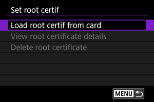 - Kako biste izbrisali korijenski certifikat importiran u fotoaparat, u izborniku u koraku 5 odaberite [Delete root certificate / Brisanje korijenskog certifikata]. Kako biste provjerili kome je izdan i tko ga je izdao, razdoblje valjanosti i druge informacije, odaberite [View root certificate details / Prikaz detalja korijenskog certifikata].