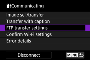 Ako se uz postavku [Enable/Omogućeno] određeno vrijeme ne prebaci nijedna snimka, fotoaparat će se odjaviti s FTP poslužitelja i prekinuti Wi-Fi vezu. Veza se automatski uspostavlja kada je fotoaparat ponovno spreman za prijenos snimke. Ako ne želite prekinuti Wi-Fi vezu, podesite na [Disable/Onemogućeno].