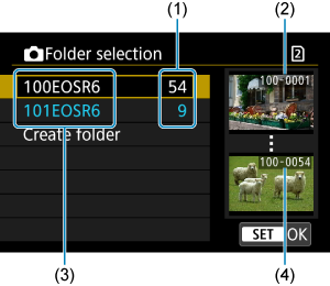 - Mapa može sadržavati do 9999 snimaka (br. datoteke 0001 – 9999). Kad se mapa popuni, automatski se kreira nova mapa s većim rednim brojem. Također, ako ručno resetirate numeriranje datoteka (), automatski će se kreirati nova mapa. Možete načiniti mape s brojevima od 100 do 999.