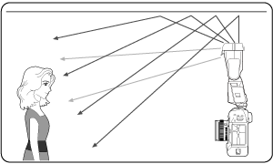 - Válasszon sima fehér vagy törtfehér mennyezetet vagy falat a fény visszaverésére, mert ezek jobban visszaverik azt. A nem fehér felületekről visszaverődő fény nem biztosít megfelelő expozíciót – nem éri elég fény a témát, valamint a felület színe befolyásolhatja a felvételeit.