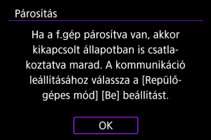Ha nem szeretne Wi-Fi-kapcsolaton keresztül csatlakozni, amikor a fényképezőgép ki van kapcsolva, állítsa a(z) [Repülőgépes mód] beállítást [Be] értékre, vagy a(z) [Bluetooth beáll.k] lehetőségnél válassza a(z) [Tilt] opciót.