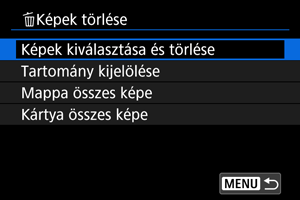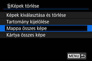 : Képek törlése] menüpontban a(z) [Mappa összes képe] vagy a(z) [Kártya összes képe] lehetőséget választja, a mappában vagy a kártyán lévő összes kép törlődik.