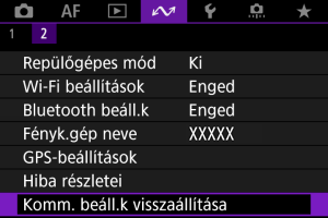 Minden vezeték nélküli kommunikációs beállítás törölhető. A vezeték nélküli kommunikáció beállításainak törlésével megakadályozhatja, hogy azok a fényképezőgép kölcsönadásakor vagy átadásakor illetéktelen kezekbe kerüljenek.