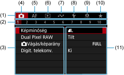 Az Alap zóna módokban egyes menülapok és menüelemek nem jelennek meg.