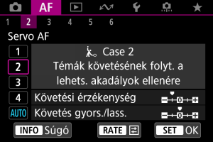 A(z) Case 1–Case A esetek a „Követési érzékenység” és a „Gyorsulás/lassulás követése” beállításainak ötféle kombinációját takarják. Az alábbi táblázat alapján válassza ki a témának és a felvételi szituációnak megfelelő esetet.