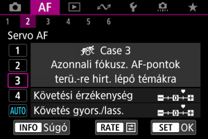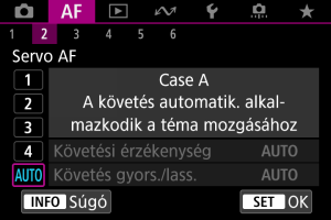 A Servo AF használatával történő felvételkészítést egy megfelelő Case * opció kiválasztásával egyszerűen a témához vagy az adott felvételi szituációhoz igazíthatja. Ez az úgynevezett AF-konfiguráló eszköz.