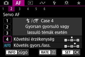 Ezzel a beállítással a fényképezőgép akkor is a témákon tartja a fókuszt, ha azok hirtelen sebességet váltanak.