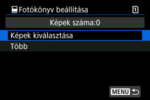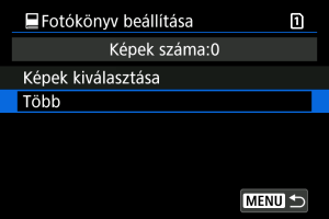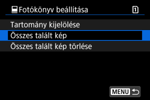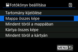 Ha a(z) [: Fotókönyv beállítása] menüpont [Több] opciójánál a(z) [Mappa összes képe] vagy [Kártya összes képe] lehetőséget választja, egyszerre megjelölheti a mappában vagy a kártyán lévő összes képet a fotókönyvhöz.
