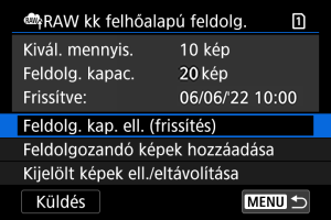 • A(z) [Feldolg. kapac.] értéke [0], hacsak nincs fizetett előfizetése a RAW-képek felhőalapú feldolgozására. Ha előfizetés nélkül ellenőrzi a feldolgozási kapacitást, akkor az image.canon webhelyen nyilvántartott e-mail-címre kap előfizetési információkat.