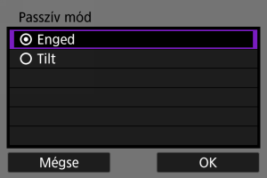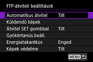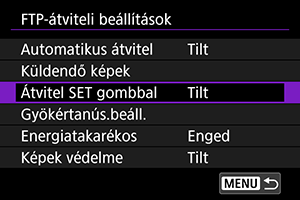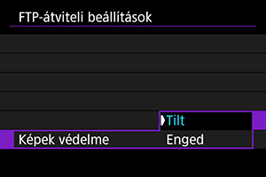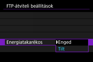 Ha a(z) [Enged] beállítás van megadva, és bizonyos ideig nem továbbít képeket, akkor a fényképezőgép kijelentkezik az FTP-szerverről, és bontja a(z) Wi-Fi-kapcsolatot. Amikor a fényképezőgép ismét készen áll a képátvitelre, a kapcsolat automatikusan újra helyreáll. Ha nem szeretné, hogy a fényképezőgép bontsa a(z) Wi-Fi-kapcsolatot, állítsa a beállítást a(z) [Tilt] értékre.