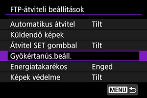 Ha a kapcsolati beállítások konfigurálása során a(z) [FTPS] FTP-módot állította be, az FTP-szerver által használt gyökértanúsítványt importálni kell a fényképezőgépre.