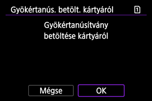 - A fényképezőgépre csak egy gyökértanúsítvány-fájl importálható. A gyökértanúsítvány-fájlt tartalmazó kártyát helyezze be még a beállítás megkezdése előtt.