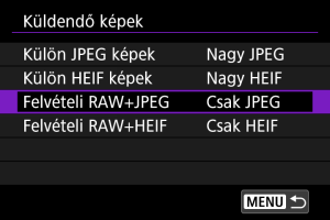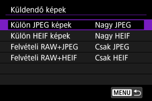 - A(z) [Külön JPEG képek] vagy [Külön HEIF képek] beállítás határozza meg az átvitt képméretet, ha a(z) [