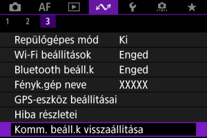 Minden vezeték nélküli kommunikációs beállítás törölhető. A vezeték nélküli kommunikáció beállításainak törlésével megakadályozhatja, hogy azok a fényképezőgép kölcsönadásakor vagy átadásakor illetéktelen kezekbe kerüljenek.