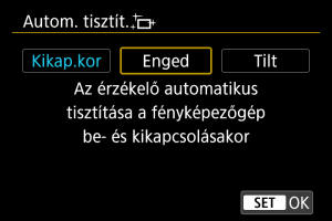 - Ha a(z) [Kikap.kor] vagy a(z) [Enged] lehetőségre van állítva, a készülék érzékelőtisztítást végez a képernyő kikapcsolásakor, az automatikus kikapcsolást is beleértve.