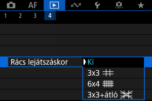 Egyképes megjelenítés esetén rács jeleníthető meg a megjelenített állóképeken a lejátszási képernyőjén. Ezzel a funkcióval kényelmesen ellenőrizheti a kép függőleges és vízszintes dőlésszögét és a kompozíciót.