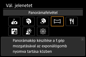 A panorámaképek készítéséhez használja a(z) [] (Panorámafelvétel) módot. A panorámakép a videókamera adott irányba történő mozgatása során készített folyamatos felvételkor rögzített felvételek kombinálásából épül fel, amelyhez az exponálógomb teljes lenyomása szükséges.