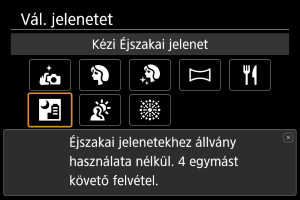 A(z) [] (Kézi Éjszakai jelenet) mód lehetővé teszi a kézi felvételek készítését éjszakai jelenetekhez. A videókamera ebben a felvételi módban egymás után négy felvételt készít minden képhez, és az ezekből kialakított, alacsonyabb mértékű bemozdulást tartalmazó képet rögzíti.