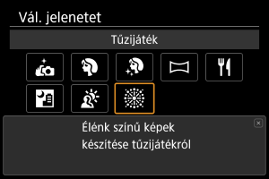 A(z) [] (Tűzijáték) mód használatával élénk színű felvételeket készíthet tűzijátékokról.