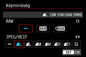 Kiválaszthatja a képpontszámot és a képminőséget. A JPEG-/HEIF-képekhez elérhető képminőség-beállítások: /