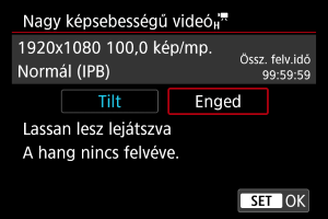 A(z) Nagy képsebesség [Be] beállítása esetén a videókamera 119,88/100,00 kép/mp beállítással képes videófájlokat rögzíteni 29,97/25,00 kép/mp képfrekvenciával.