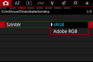 - Válassza a(z) [sRGB] vagy [Adobe RGB] lehetőséget, majd nyomja meg a(z)