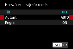 A zajcsökkentést a készülék minden 1 másodperces vagy hosszabb expozíció esetén elvégzi. A(z) [Enged] beállítással azok a zajok is csökkenthetők, amelyek a(z) [Autom.] beállítással nem észlelhetők.