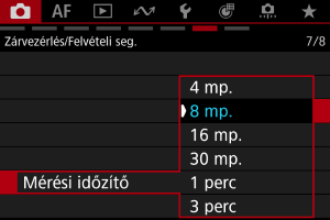 Beállíthatja, hogy miután valamilyen művelet (például az exponálógomb félig történő lenyomása) miatt automatikusan megjelent, milyen hosszú ideig számoljon a mérési időzítő (ez határozza meg az expozíciósérték-megjelenítés/AE-rögzítés időtartamát).