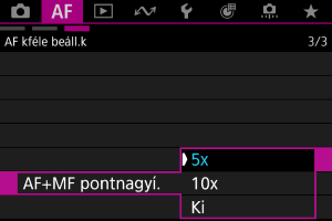 : AF+MF pontnagyí.] beállításnál, akkor a képernyő 5x-ös vagy 10x-es nagyításban jelenik meg a fókusz finomhangolása során.