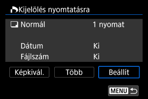 Megadhatja a nyomtatási beállításokat, például a nyomatformátumot, a dátumnyomtatást, a fájl számának nyomtatását és így tovább. A rendszer a nyomtatásra kijelölt összes képre alkalmazza a nyomtatási beállításokat. (Ezek az értékek nem adhatók meg külön minden egyes képhez.)
