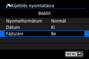 - A nyomatformátumtól és a nyomtatómodelltől függően előfordulhat, hogy még a(z) [Dátum] és [Fájlszám] funkció [Be] beállítása esetén sem kerül sor a dátum vagy a fájlszám nyomtatására.