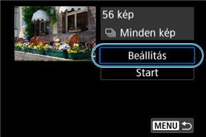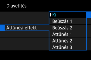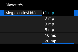 - Állítsa be a(z) [Megjelenítési idő], [Ismétlés] (ismételt lejátszás), valamint [Áttűnési effekt] (képek közti váltáskor alkalmazott effektus) beállításokat állóképekhez.