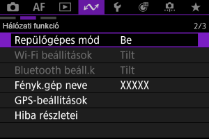 Ha nem szeretné fenntartani a(z) Wi-Fi- vagy Bluetooth-kapcsolatot, amikor a videókamera ki van kapcsolva, állítsa a(z) [: Repülőgépes mód] beállítást [Be] értékre, vagy a(z) [