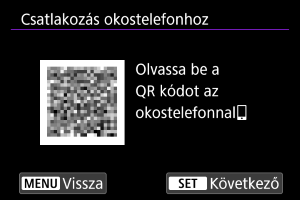 - Ha nincs telepítve a Camera Connect, olvassa be az okostelefonnal a képernyőn megjelenő QR-kódot, nyissa meg a Google Play vagy az App Store áruházat a Camera Connect letöltéséhez, majd nyomja meg a(z)