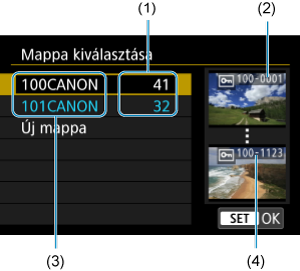 - Egy mappában legfeljebb 9999 kép tárolható (fájlok száma 0001–9999 között). Ha egy mappa megtelik, automatikusan új, az előzőnél eggyel nagyobb számú mappa jön létre. Ezenkívül kézi visszaállítás esetén () automatikusan új mappa jön létre. Mappák 100-tól 999-ig tartó számozással hozhatók létre.