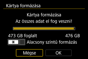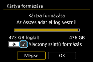 - Az alacsony szintű formázást a(z) [Mégse] lehetőség kiválasztásával bármikor megszakíthatja. A készülék még ebben az esetben is végrehajtja a normál formázást, ezért a szokásos módon használhatja a kártyát.