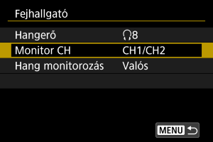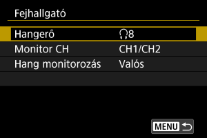 A videófelvétel során kiválaszthatja a fejhallgató-kimenethez használt hangot. A hangfelvétel során a zaj csökkentéséhez konfigurálja a(z) [Hang zajcsökkent.] () beállítást.