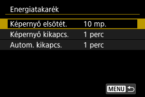 - A(z) [Képernyő elsötét.] és a(z) [Képernyő kikapcs.] beállítások akkor érvényesek, amikor a felvételi képernyőt használja. Ezek a beállítások a menü kijelzése és képlejátszás során nem érvényesek.