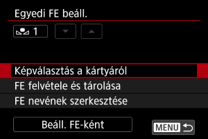 - A(z) [Egyedi FE beáll.] képernyőn válassza ki a regisztrált egyedi fehéregyensúly számát, amelyhez nevet szeretne hozzáadni.