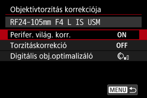- Ha a(z) [Digitális obj.optimalizáló] a(z) [Normál] vagy [Magas] lehetőségre van állítva, a(z) [Színtorzítás korr.] és a(z) [Diffrakció-korrekció] lehetőség nem jelenik, de a készülék mindkét beállítást [Enged] értékre állítja.